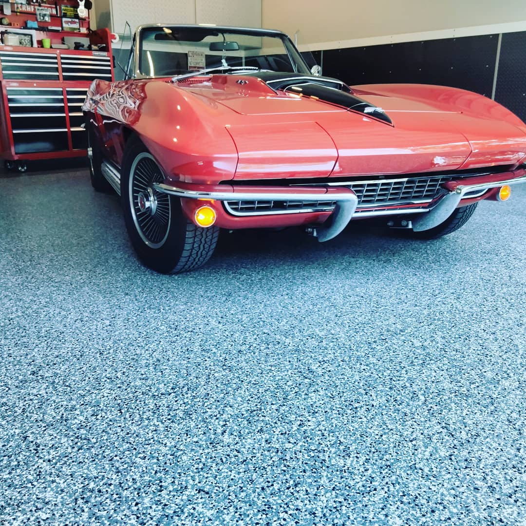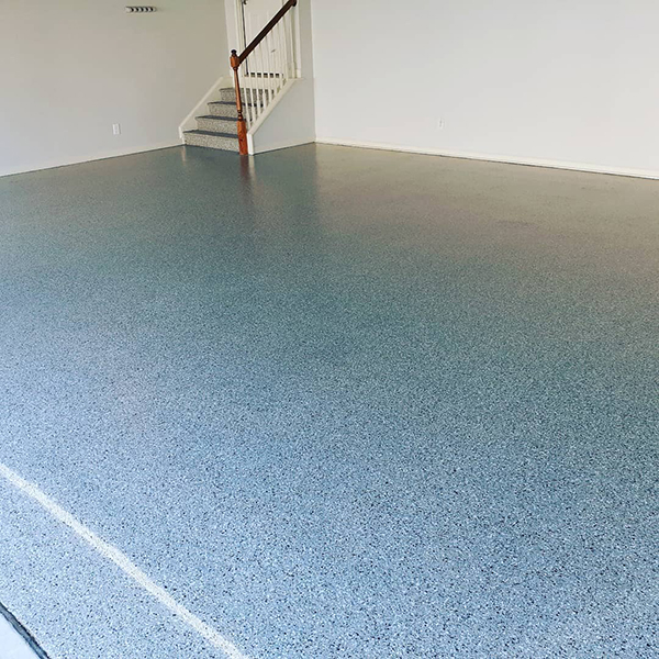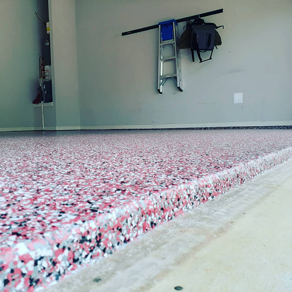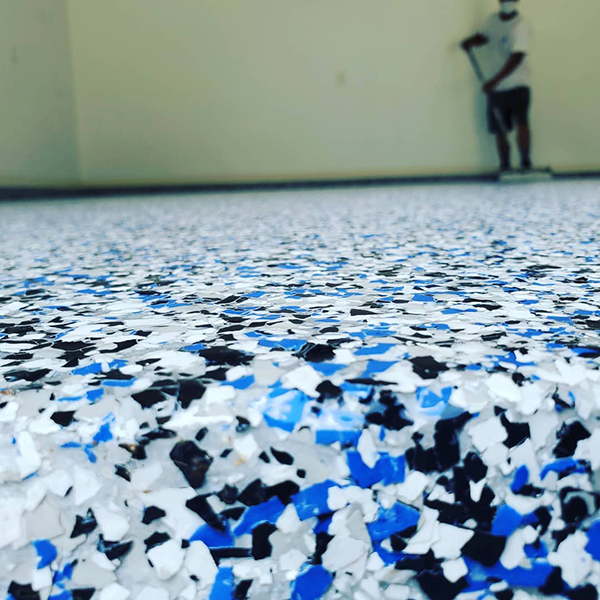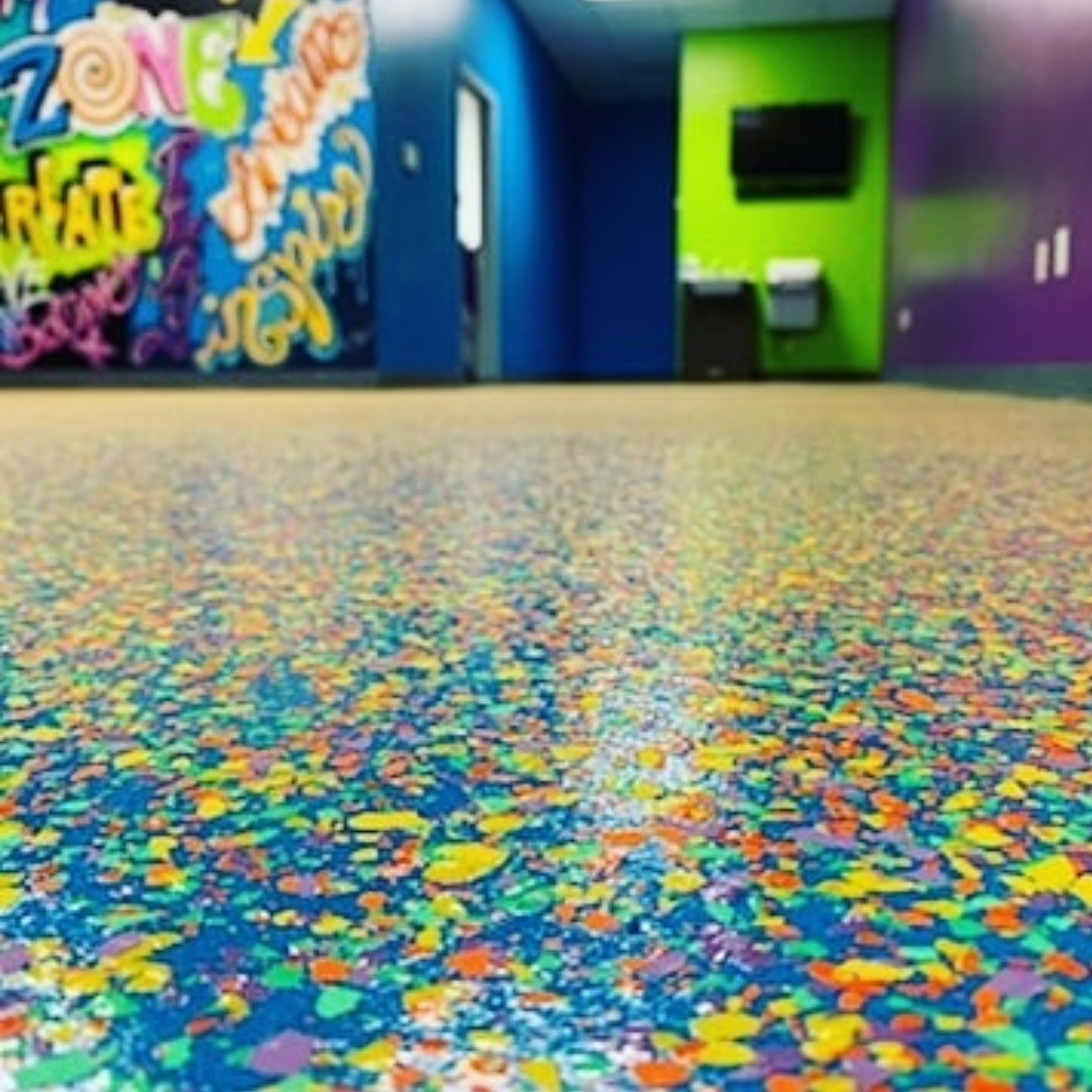 This extremely durable product consists of multicolored vinyl flake that are topcoated with a polyaspartic topcoat.